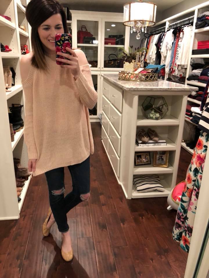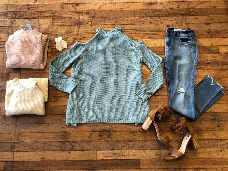 Camille Cold Shoulder Sweater in Pink, Cream, and Blue