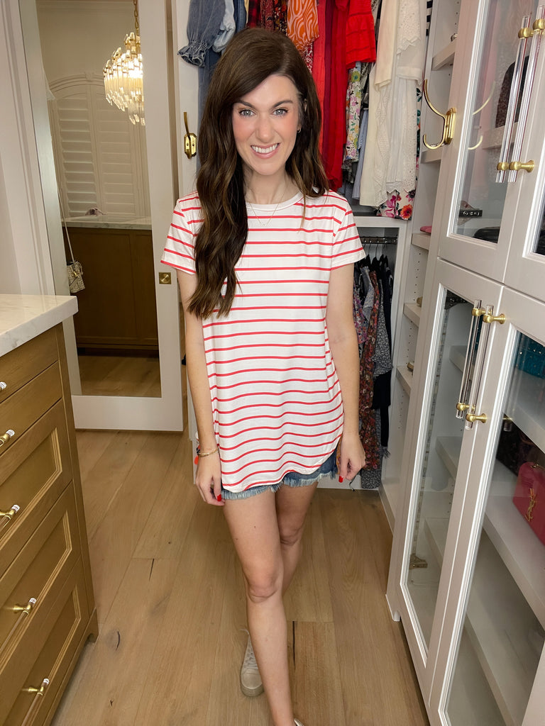 Introducing the Keep it Classic Tee in White/Red! Perfect for summer with its white and red stripes, this classic basic is a must-have in any closet. Made with butter soft fabric, it can easily transition into fall with its tunic length. Wear it with your favorite shorts, jeans, or leggings - a versatile top you'll want to wear over and over again!  Top measures 27" in length.  Bust measures 19" from underarm seam to seam.  Measurements taken on a small.  Fabric has stretch.  This has stretch and an easy fit through the bust and hips.  We recommend grabbing your normal size.  If in between sizes, size up or down based on preferred fit (a little roomier or true to size).  Be sure to watch the fit video for more information.  ALL SALES FINAL.